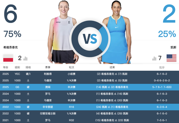 双方过往碰面次数不少,包括今年的澳网、马德里站,两人各胜一场,现在来到年终总决赛,斯瓦泰克取得了完胜。