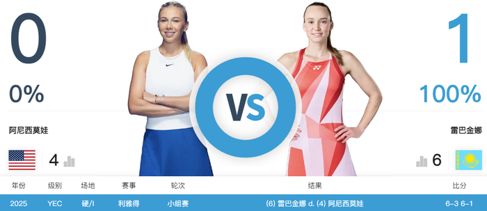 第二盘,阿尼西莫娃依然没有找到此前温网、美网打进决赛,以及拿下中网冠军的状态,开局0-3落后,最后1-6再输一盘,大比分0-2遭到横扫,年终总决赛首秀遭遇完败。